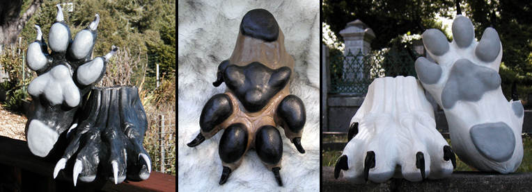 These huge, aggressively textured feet will fit up to a size 14 (American) foot. From claw tip to heel these paws are over 15" long. Due to their size, the hindpaws are foam filled and wet suit booties are incorporated into the paws. Shoe size must be specified at the time of ordering, as well as your choice of skin, pad and claw color.