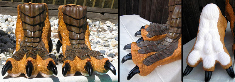 Designed to slip on over shoes, these feet in their base configuration have no additional padding. The soles have embedded cloth reinforcement. Additional cloth reinforcement is included in the the main body of the foot as well, to help it maintain its shape. Claws are hard resin.
