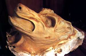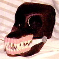 The next step is making the underskull for the head. It's made out of fiberglass and serves to hold the shape of the skin and the teeth (sculpted and molded separately, and made from dental acrylic). It also lets the jaw move realistically, and allows for other motions, such as a snarl. The skullcap fits over the actor's head. Newer heads are using a cap made from lighter foam instead.